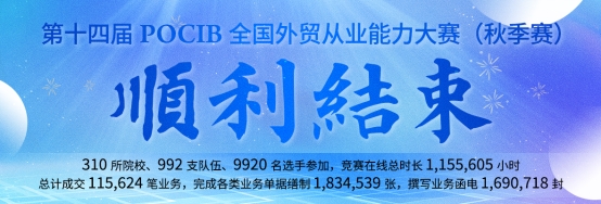 据悉:POCIB全国外贸从业能力大赛由中国国际贸易学会主办,是目前国际经济贸易专业领域参赛人数较多、展示我国外经贸教育成果和相关专业学生专业水平的顶级赛事。竞赛分为POCIB国际贸易从业技能综合实训模块和数字贸易B2B模块两项内容。POCIB国际贸易从业技能综合实训模块的考核内容包括国际贸易买卖合同的磋商过程,询盘、发盘、还盘和接受环节的英文函电写作技巧;主要贸易术语和结算方式的细节和运用;进出口商品的价格核算、成本控制和扩大利润的方法;国际贸易买卖合同的商定;进出口业务履约基本技巧;主要进出口单据的缮制与运用等。数字贸易B2B模块的考核内容包括在数字贸易B2B电商平台中进行店铺入驻、商品发布、交易磋商、起草订单、订单履约和营销活动等跨境电商外贸环节中的各项业务流程操作。本届比赛吸引了全国310所院校、992支队伍、9920名选手参加,竞赛在线总时长1155605小时,总计成交115624笔业务,完成各类业务单据1834539张,撰写业务函电1690718封。
