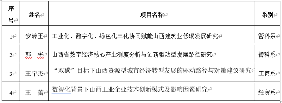 3月24日,山西省第五次全国经济普查领导小组办公室发布了“山西省第五次全国经济普查研究课题立项公示”,我院获批4项,占全省立项总数的10%,占全校立项总数的100%。