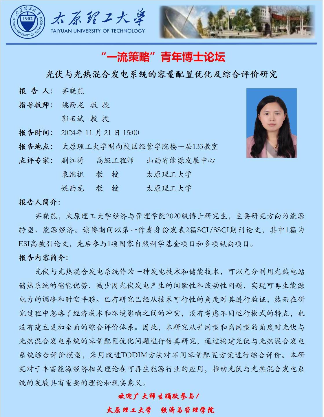 齐晓燕“一流策略”青年博士论坛“光伏与光热混合发电系统的容量配置优化及综合评价研究”