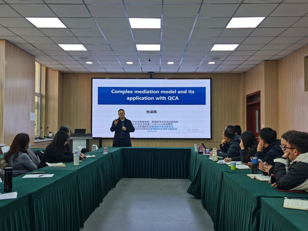 报告中,杜运周教授介绍了申请科研项目的心得体会,从基本常识、申报经验等方面,讲解了如何做好项目申请工作。其次,从项目申报分类、好的科学问题甄别、申报现状、管理科学部资助导向等方面,强调了项目选题的注意事项。再次,围绕已申报项目、国家社科基金题目的类型、核心词等方面,结合具体项目申报书进行了分享,强调了研究背景与意义在申请书撰写中的重要性。最后,介绍了复杂中介模型的原理与价值,并与现场师生进行了互动答疑。