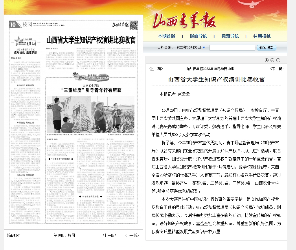 据了解,今年知识产权宣传周期间,省市场监督管理局(知识产权局)联合有关部门在全省范围内开展了知识产权“六联六进”活动,联合省教育厅、团省委开展“知识产权进高校”就是其中的一项重要内容。首届山西省大学生知识产权演讲比赛于5月份启动,经学校选拔推荐,来自全省20所高校的72名选手进入复赛环节,最终有16名选手晋级决赛。经过激烈角逐,最终产生一等奖3名、二等奖5名、三等奖8名,山西农业大学等5所高校获得优秀组织奖。