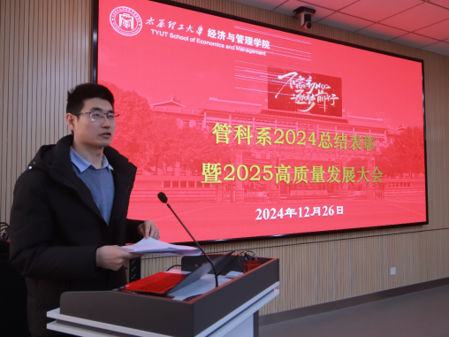 1226日,经济与管理学院229会议室内洋溢着欢乐吉祥、喜气洋洋的氛围,管科系在此隆重举行2024总结表彰暨2025高质量发展大会”。学院党委书记闫新、院长栗继祖、副院长陈怀超、副院长兼管科系主任王天日、工会主席党政办主任戴鸢、教科办主任刘霄燕、学工办副主任张志卿、经贸系主任李国敏、会计系主任张美丽和管科系全体教师出席,会议由管科系副主任何学松主持。