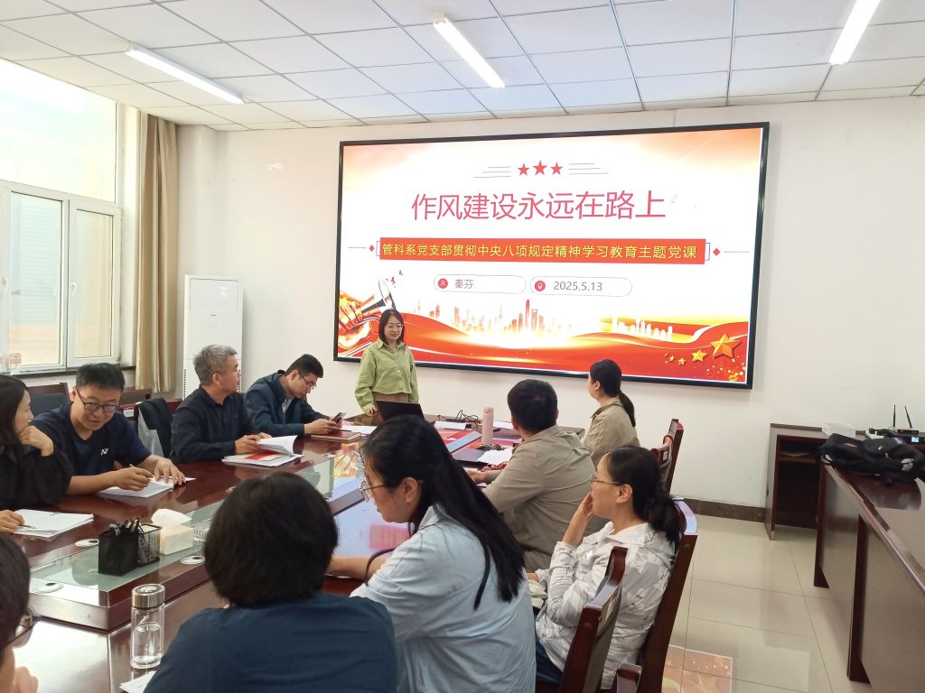为深入贯彻落实学校《关于开展深入贯彻中央八项规定精神学习教育的工作方案》(校党【2025】17号),5月13日上午,管理科学系党支部在 226办公室召开主题党课,本次党课由管科系党支部组织委员秦芬主讲,广大党员教师积极参与,王天日副院长到会指导。本次党课从“党的作风关系党和国家的前途命运、生死存亡”“新时代作风建设取得历史性、开创性成就”“推进作风建设常态化长效化”三方面展开。党的作风关系党和国家的前途命运、生死存亡。...